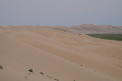 We drove a short distance to Khongor sand dunes. The highest one in this area is 120 meters/394 feet tall. The sand moves around quite a bit and when it does it makes noise, so these dunes are also called the "singing dunes".